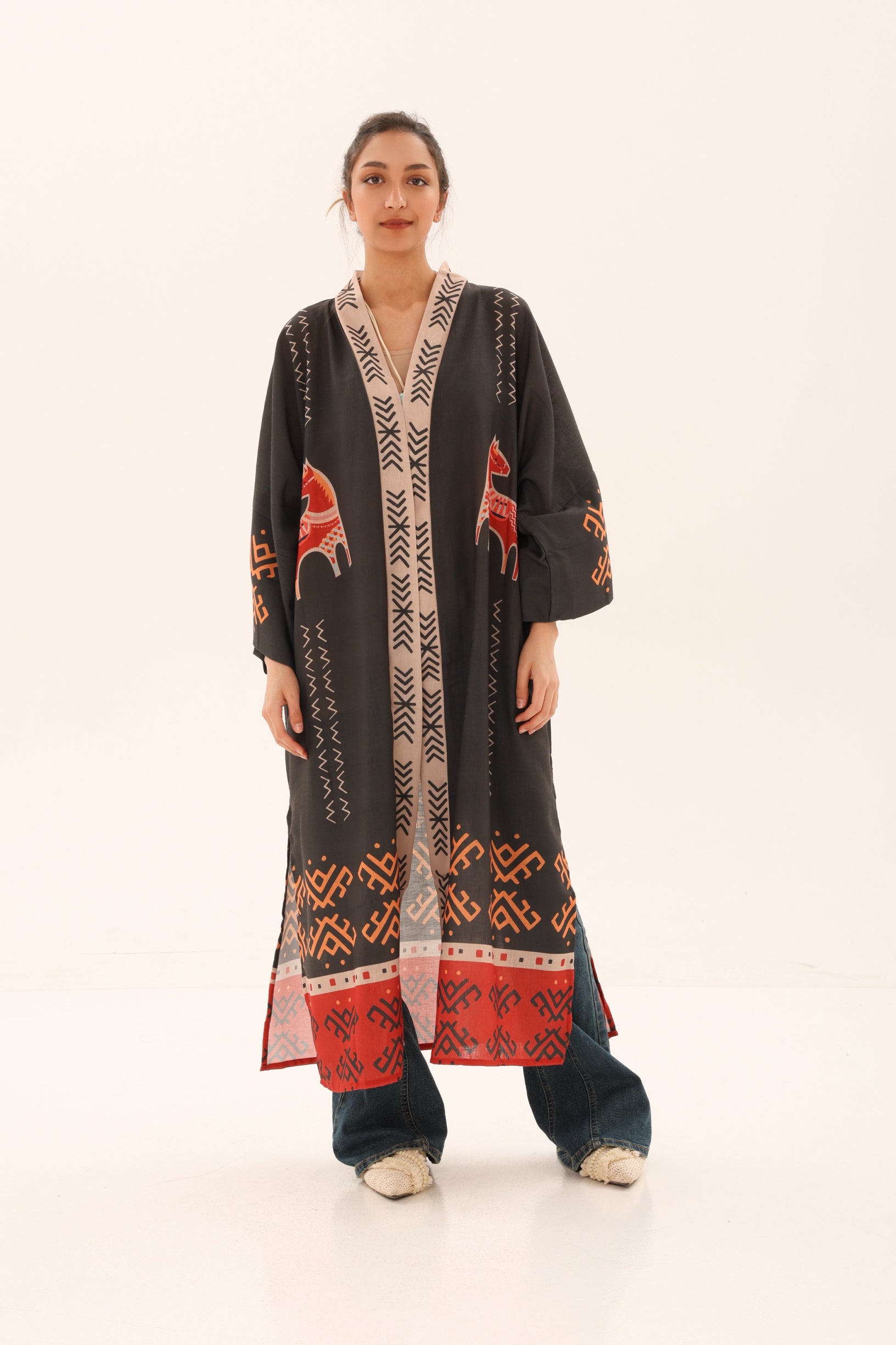 Embrace heritage-inspired elegance with this linen kimono, crafted for a breathable, natural feel and effortless wear. Designed on a deep charcoal base, the piece features intricate folkloric patterns and symbolic motifs, highlighted by striking illustrated horses and geometric detailing in warm rust and ivory tones. The relaxed silhouette and lightweight linen drape create ease and movement, while the richly detailed back panel makes it a true statement of culture and artistry. A timeless design that blends tradition, storytelling, and modern comfort.