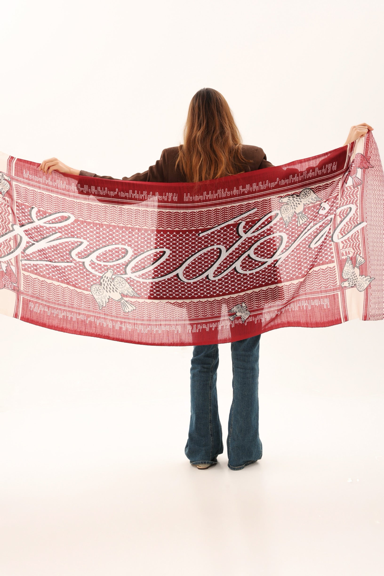 Embrace meaningful heritage with this rectangular mixed cotton scarf, designed with a soft, breathable feel and an easy, natural drape. Inspired by traditional Palestinian patterns, the design features classic keffiyeh-style motifs layered with symbolic illustrations and expressive calligraphy in rich shades of deep red, ivory, and charcoal. Finished with subtle fringe edges, this scarf blends cultural storytelling with everyday versatility—an expressive piece that carries identity, history, and modern style in every fold.