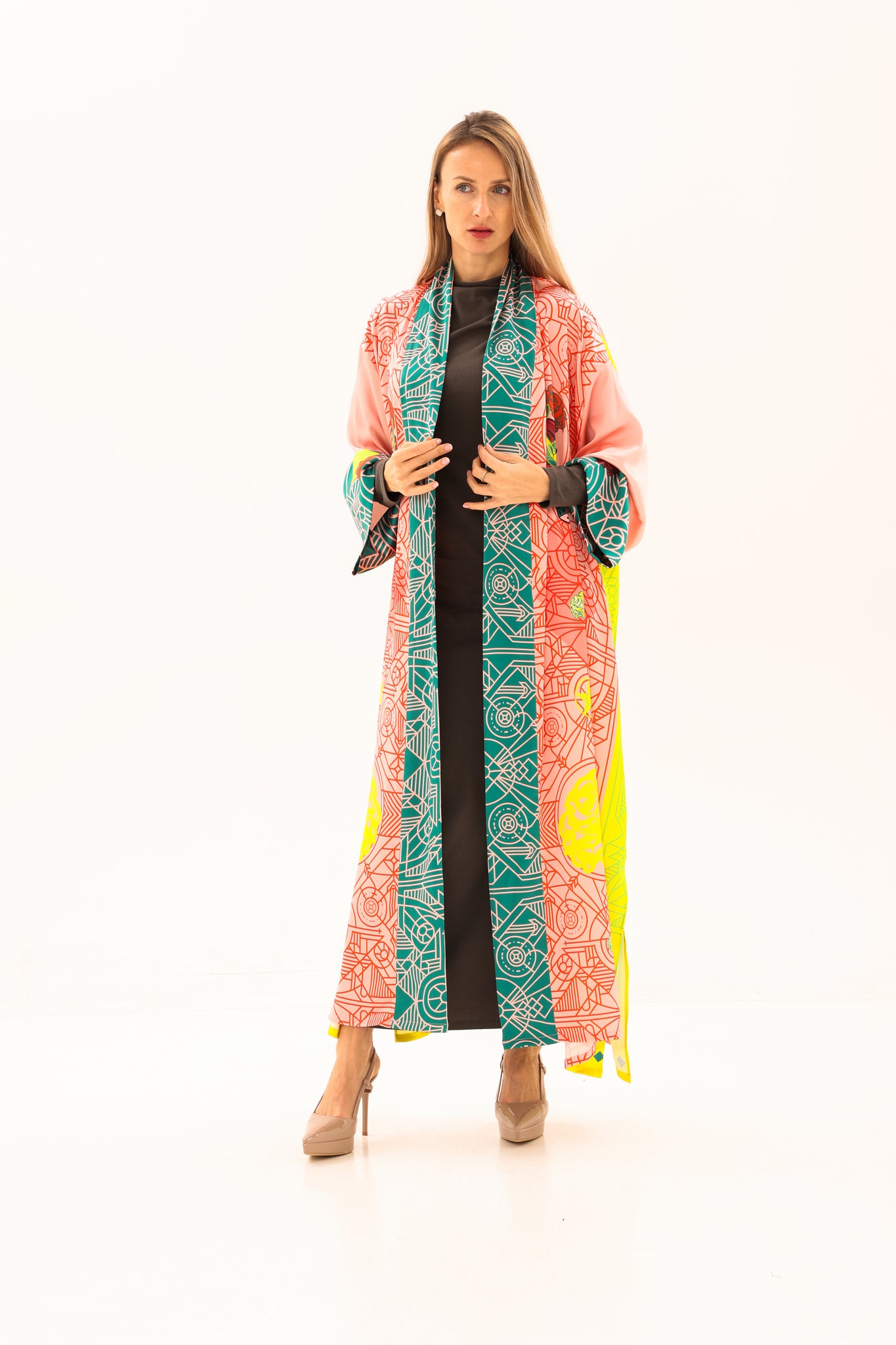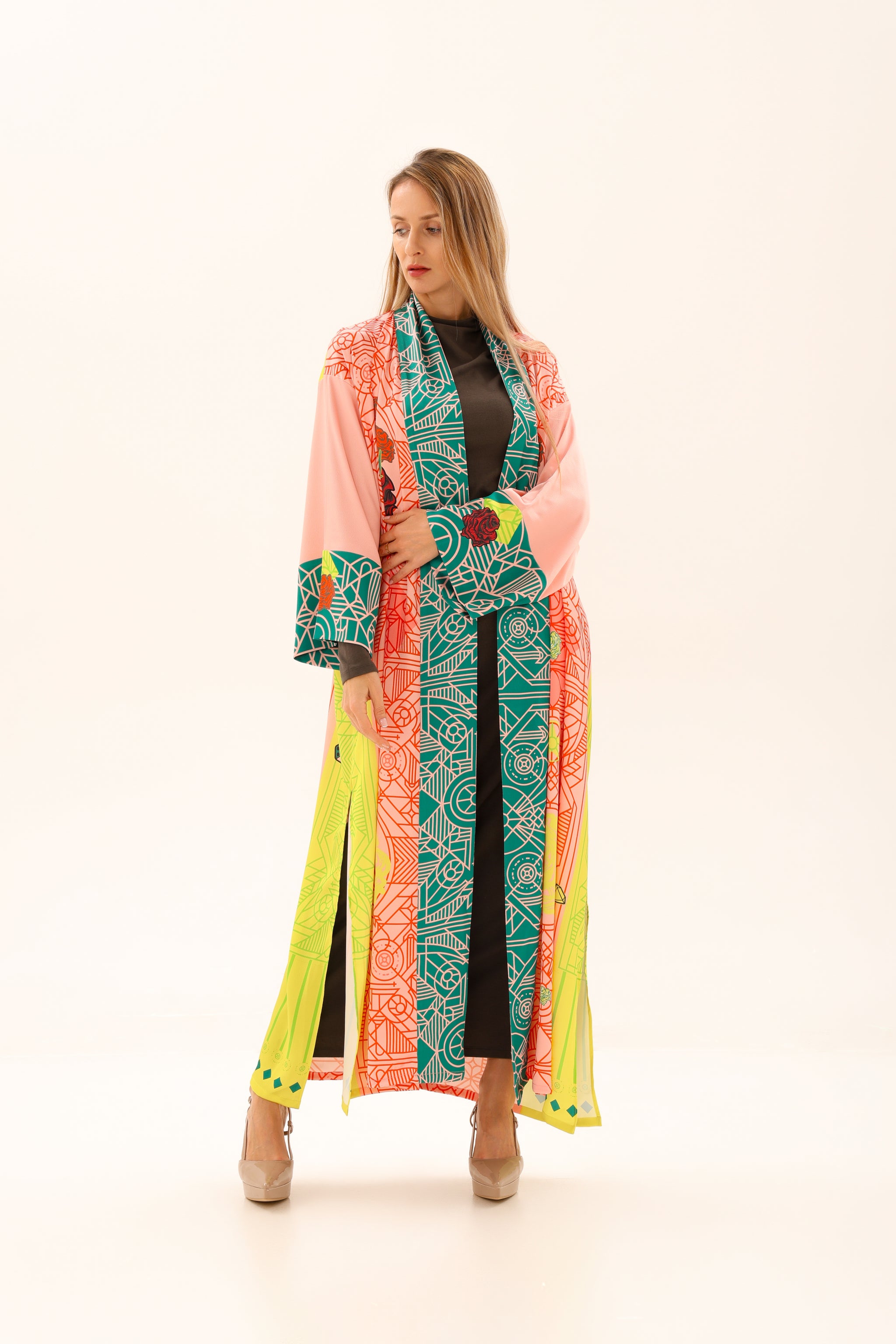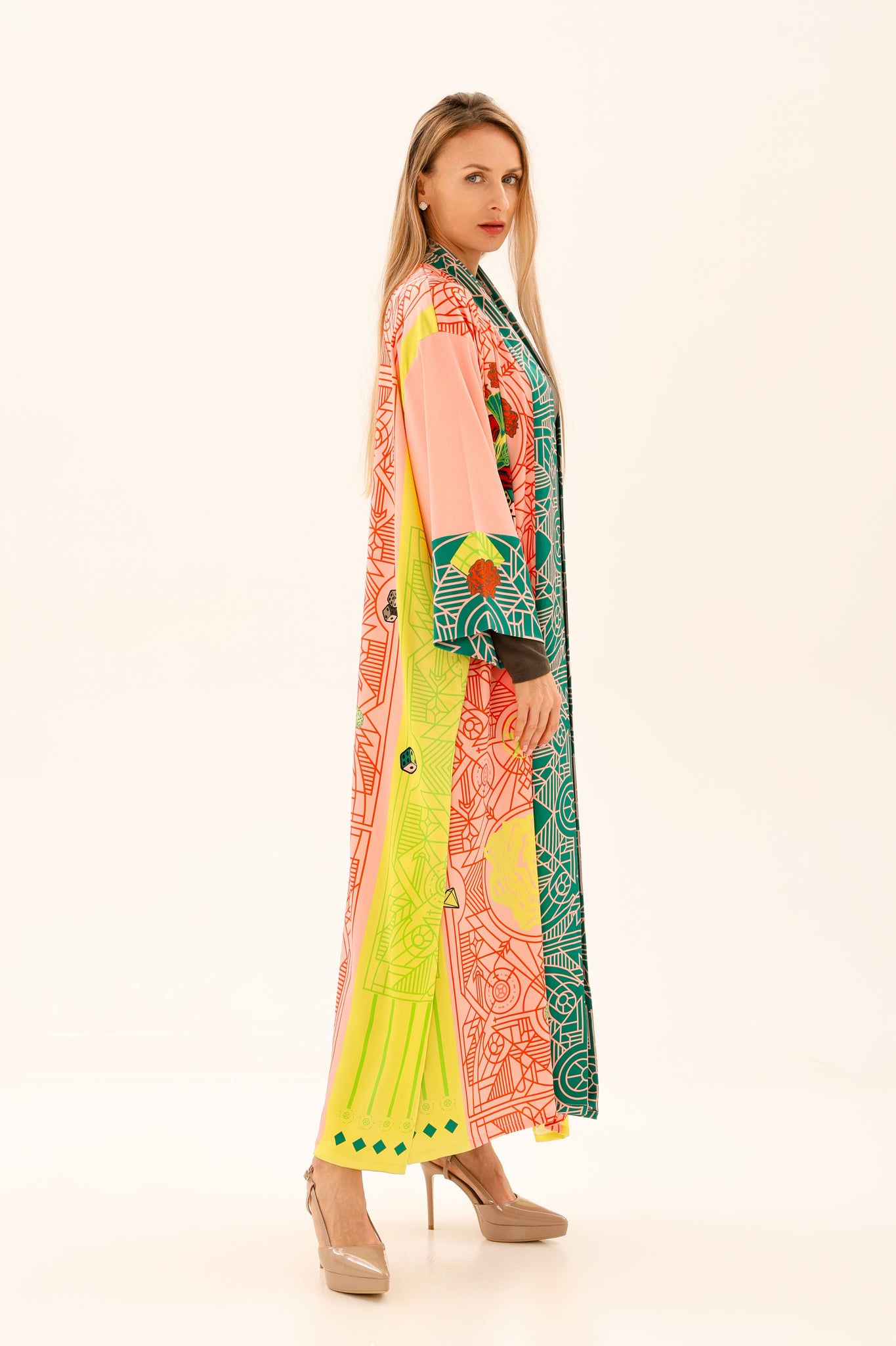 Embrace radiant expression with this textured satin kimono, designed to captivate through bold color and intricate artistry. Set against a luminous coral base, the design features refined Art-Deco–inspired geometric linework layered with vivid illustrated motifs, including symbolic birds, roses, and playful accents. Neon lime and emerald details energize the silhouette, while the fluid satin drape moves effortlessly with every step. A statement piece that celebrates confidence, creativity, and the beauty of wearing art.