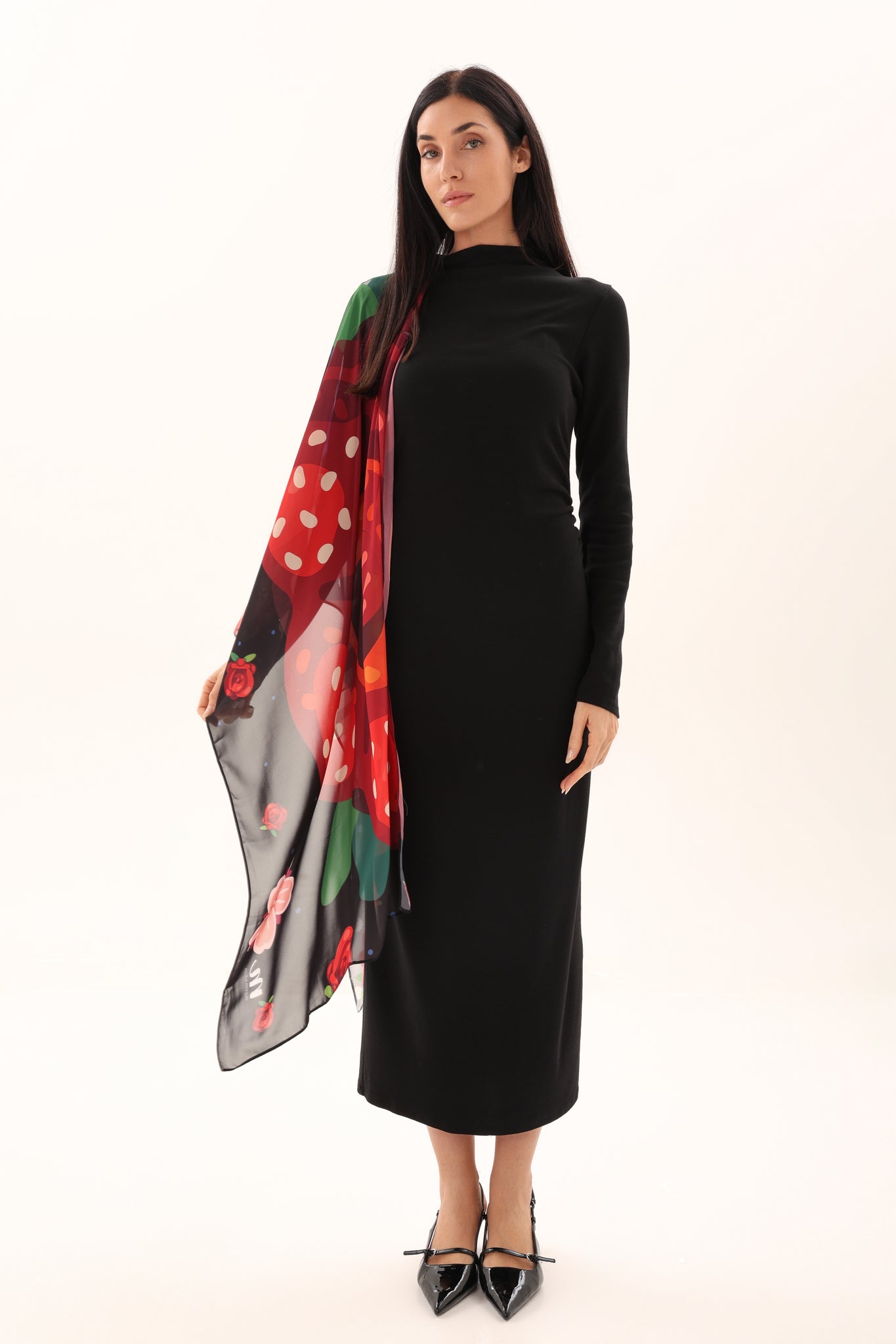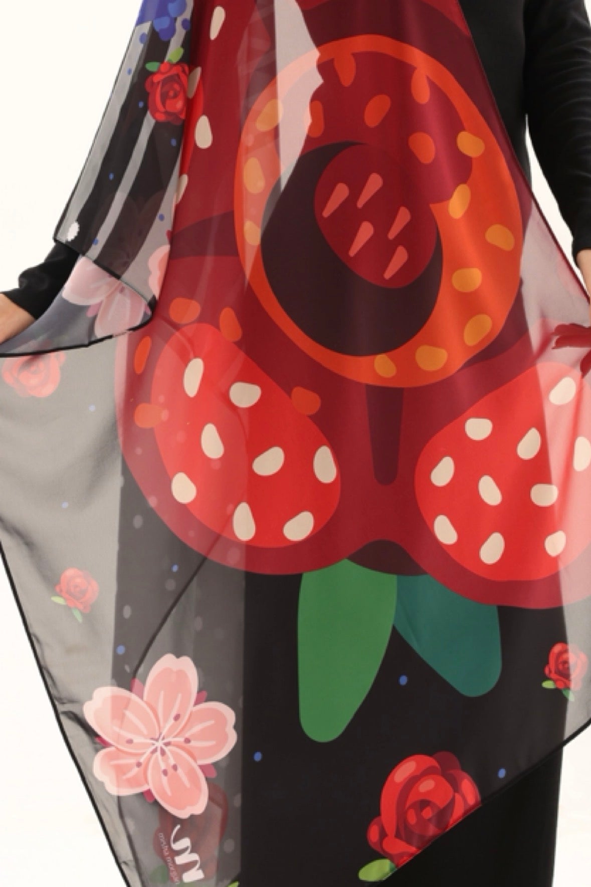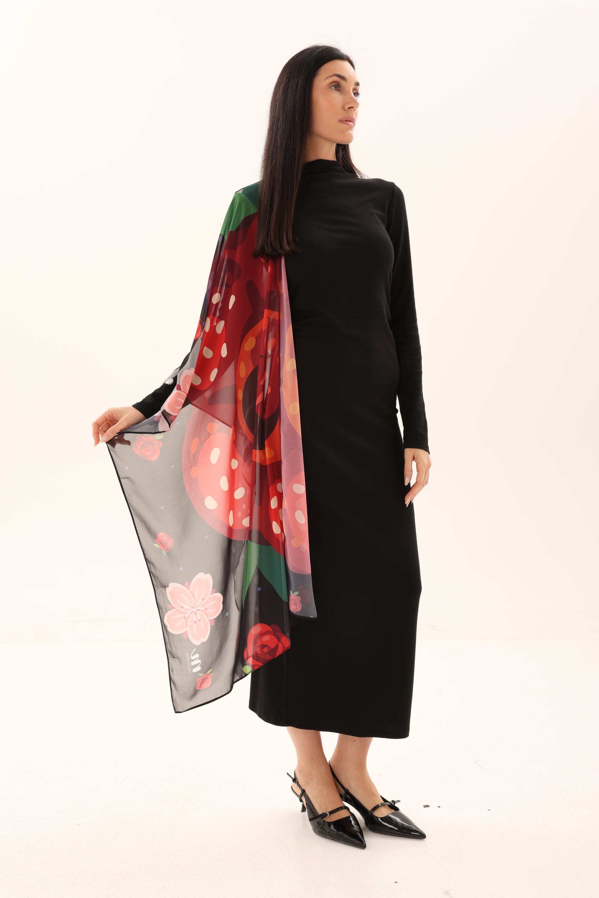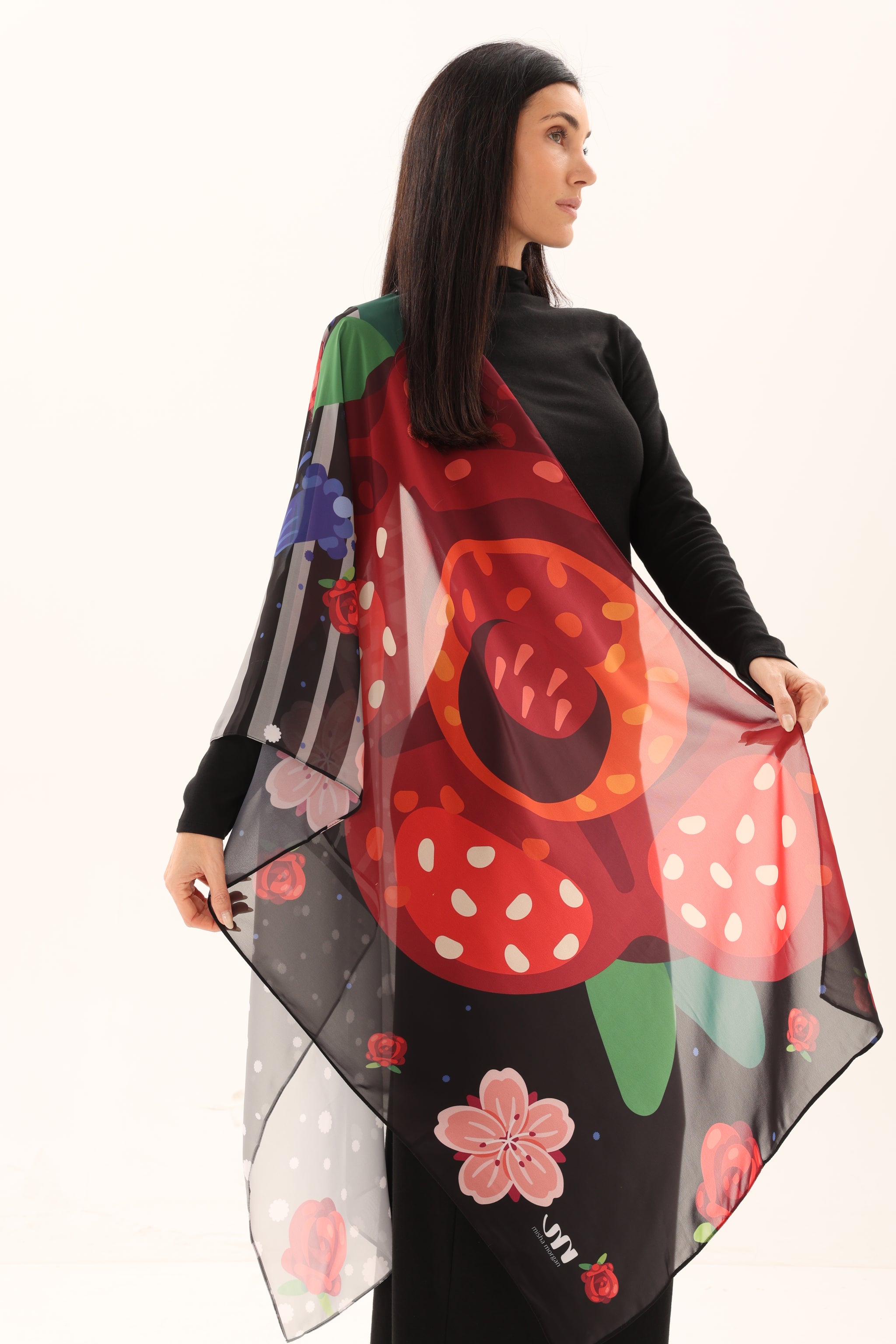 Embrace playful elegance with this soft chiffon scarf, designed with a sheer, airy drape that flows effortlessly. The design features a bold oversized floral motif in vibrant shades of red, green, and soft blush, layered over a dark base for striking contrast. Delicate illustrated details add depth and charm, while the lightweight chiffon enhances movement and fluidity. A statement piece that blends femininity, color, and artistic expression—perfect for elevating both casual and refined looks.