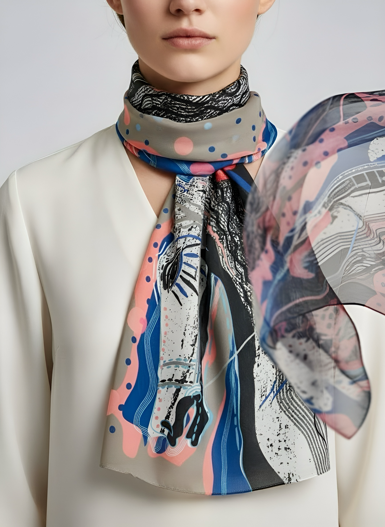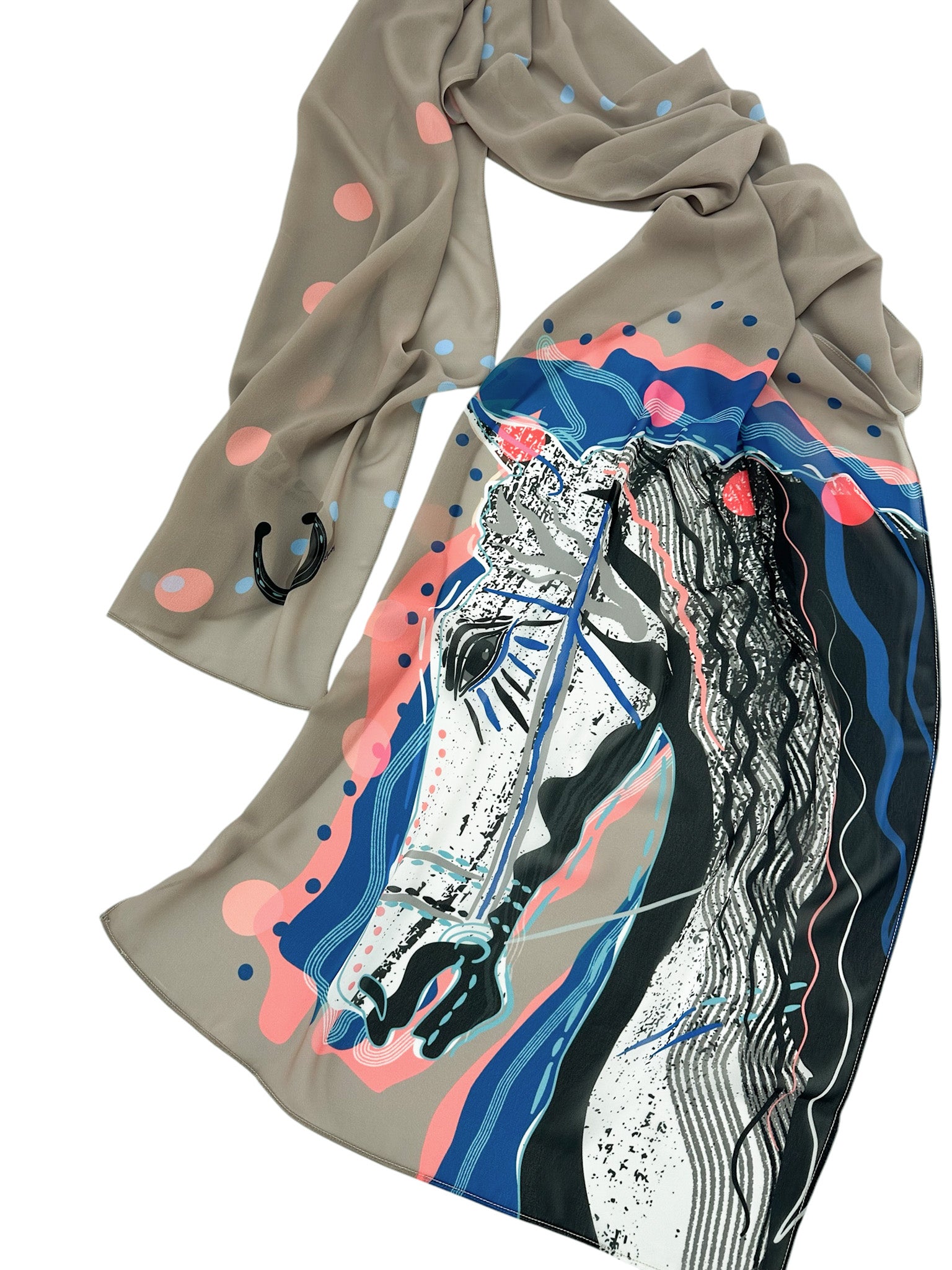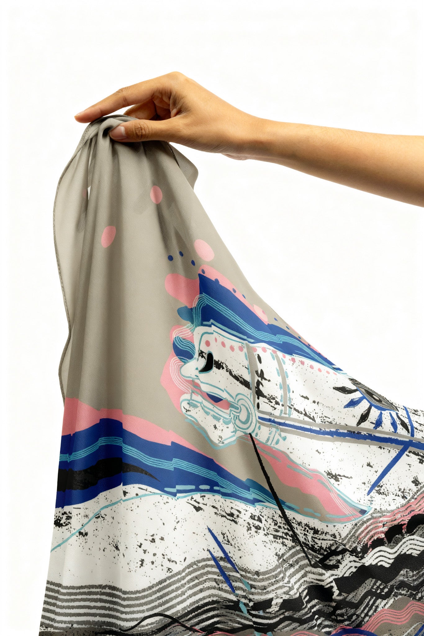 Embrace bold storytelling with this soft chiffon scarf, designed with a light, airy drape that moves effortlessly. Set in fiery shades of laté and blue shades, the design features a striking illustrated animal motif layered with fluid linework and textured accents. The sheer chiffon