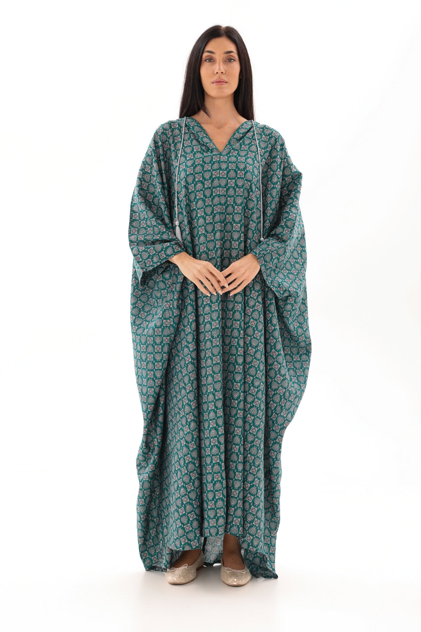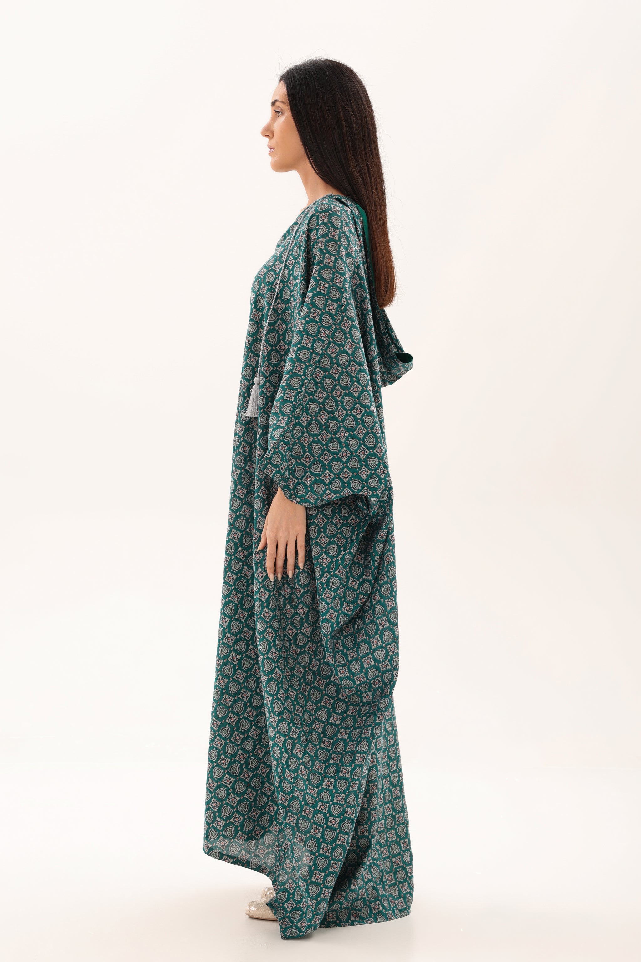 Embrace effortless comfort with this Moroccan-inspired abaya, crafted from soft mixed cotton for a breathable, natural feel. Designed in a rich teal tone, the piece features an all-over geometric motif that adds subtle texture and cultural depth. The relaxed silhouette flows freely, enhanced by wide sleeves and a softly draped hood finished with delicate tie details. Lightweight and easy to wear, this abaya blends tradition with modern ease—perfect for everyday elegance and relaxed styling.
