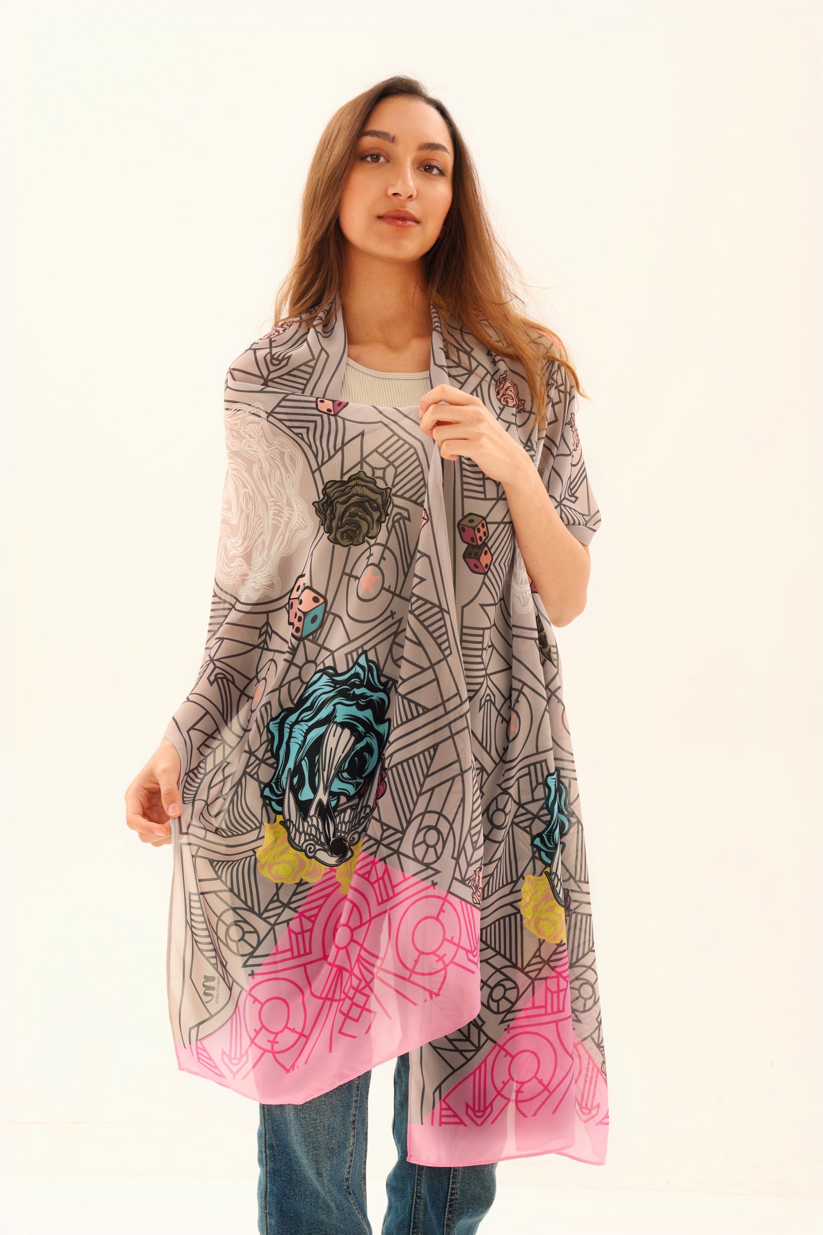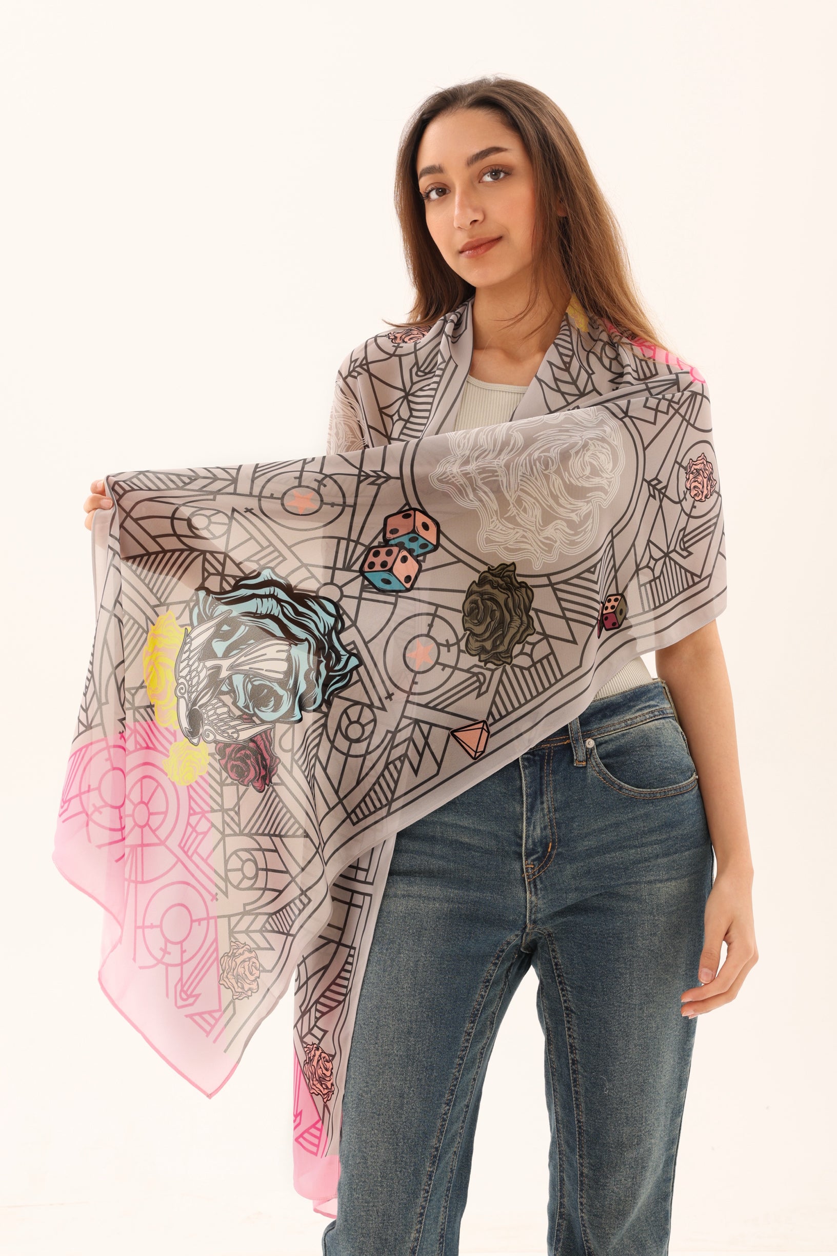 This soft chiffon scarf is a refined fusion of geometry and symbolism, designed to move like air while making a bold artistic statement. Crafted from sheer, lightweight chiffon, it drapes effortlessly with a fluid, graceful fall. The design features intricate Art-Deco–inspired linework layered with expressive illustrated elements—delicate birds, sculptural roses, and scattered dice—set against a muted grey base and accented with soft blush pink highlights. Subtle pops of color emerge through the transparency of the fabric, creating depth and dimension as the scarf shifts with movement. Elegant yet expressive, this piece adds a poetic edge to both minimal and statement looks.