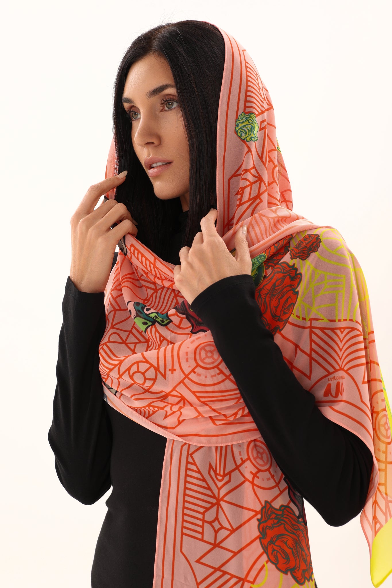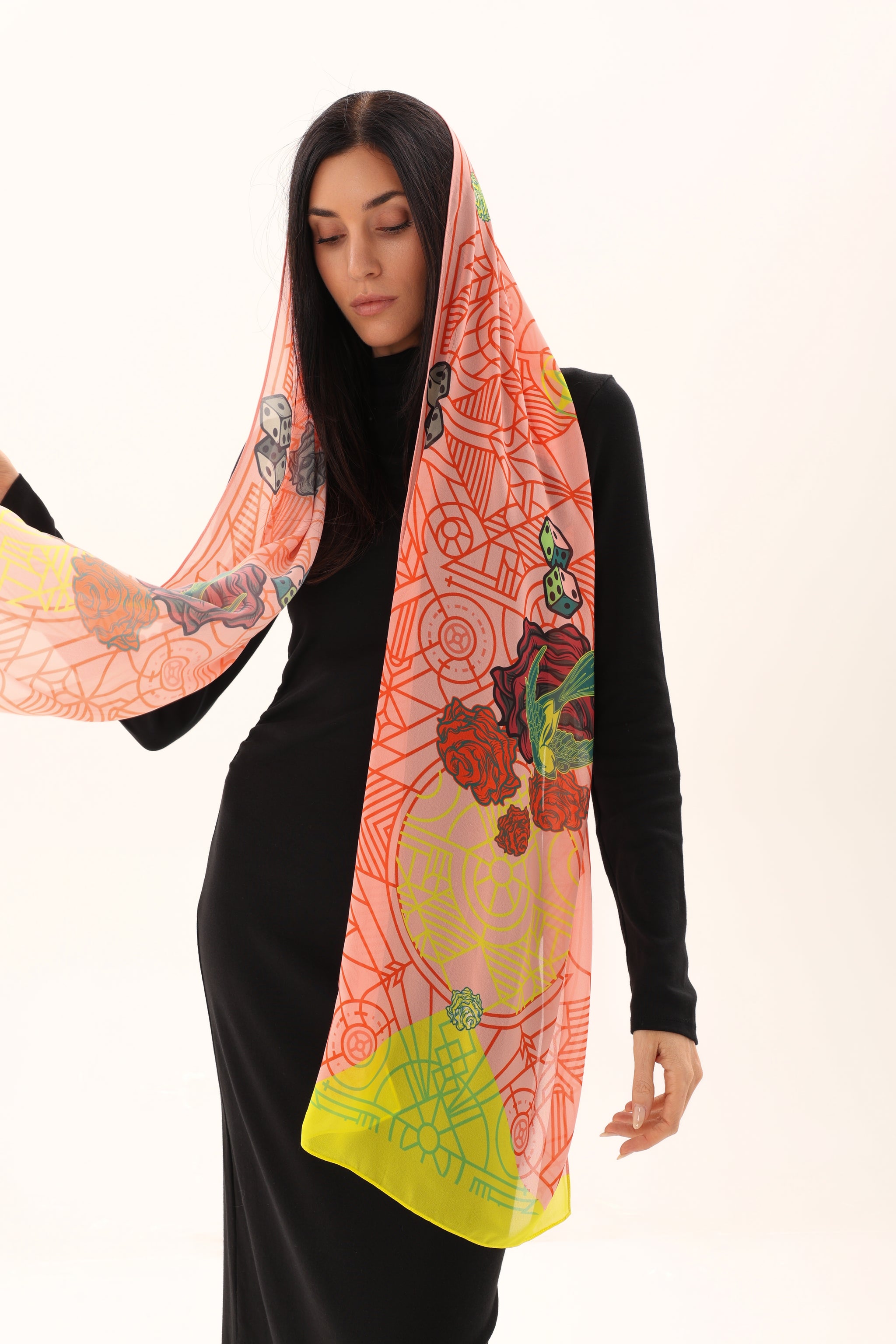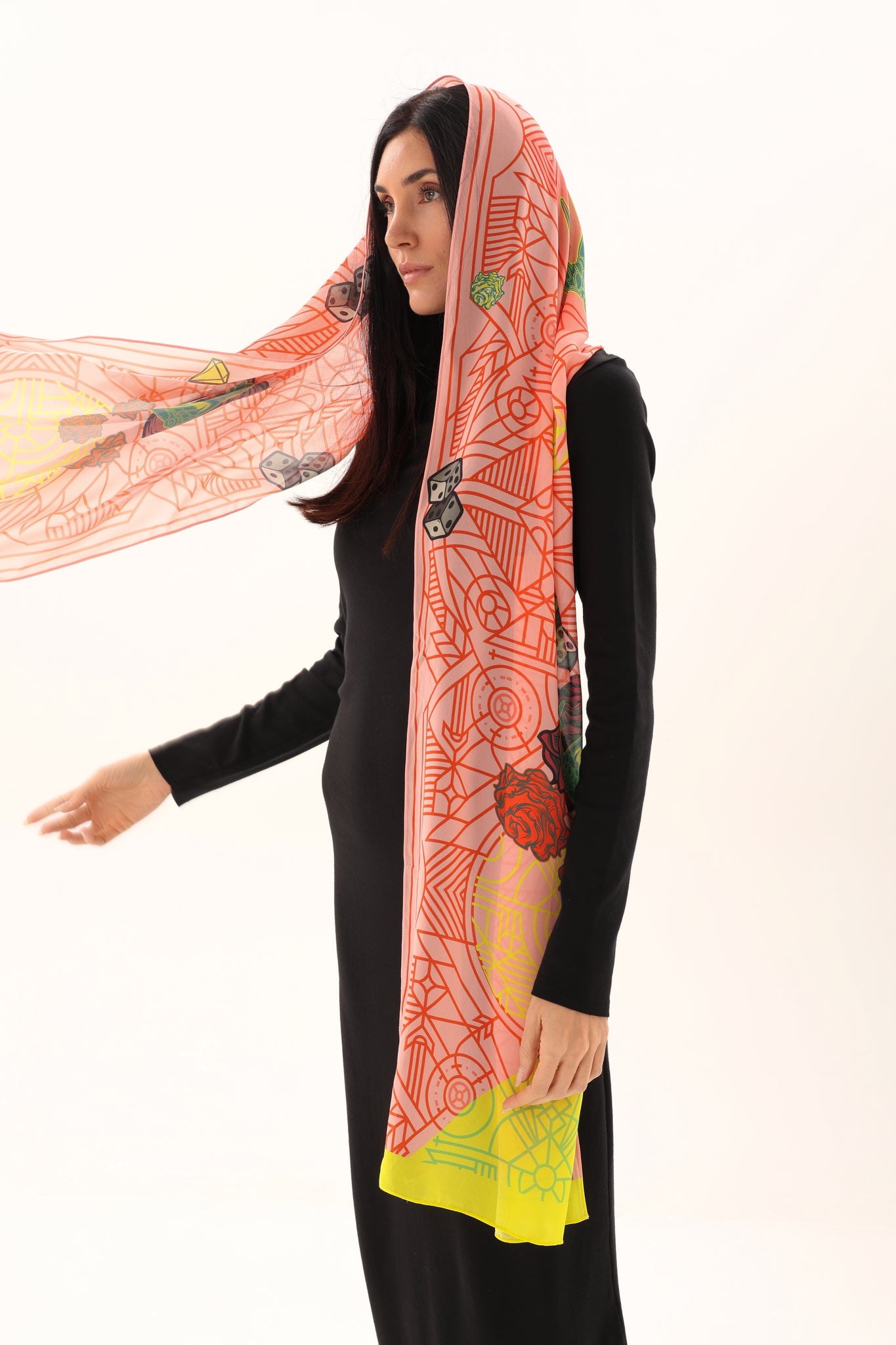 This soft chiffon scarf is a delicate statement of art and movement. Crafted from lightweight, sheer chiffon, it drapes fluidly with an airy elegance that feels effortless on the skin. The design blends fine Art-Deco–inspired geometric linework with expressive illustrated elements—scattered dice, blooming roses, and subtle symbolic details—layered over a warm coral base with touches of lime yellow and muted green. The translucency of the chiffon allows the colors and lines to softly overlap, creating depth and visual rhythm with every fold. A refined yet expressive accessory, perfect for elevating minimal looks or complementing bold ensembles.