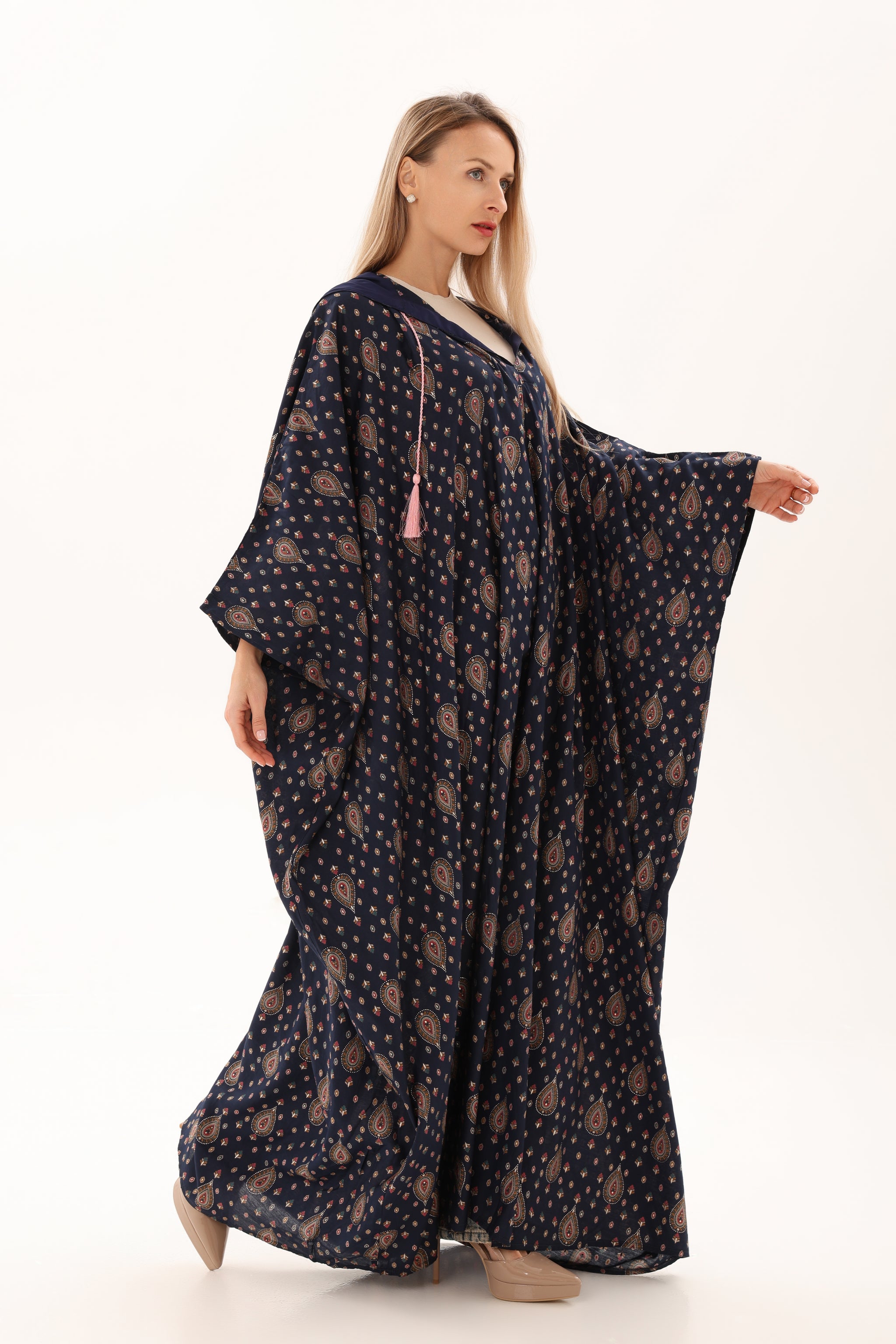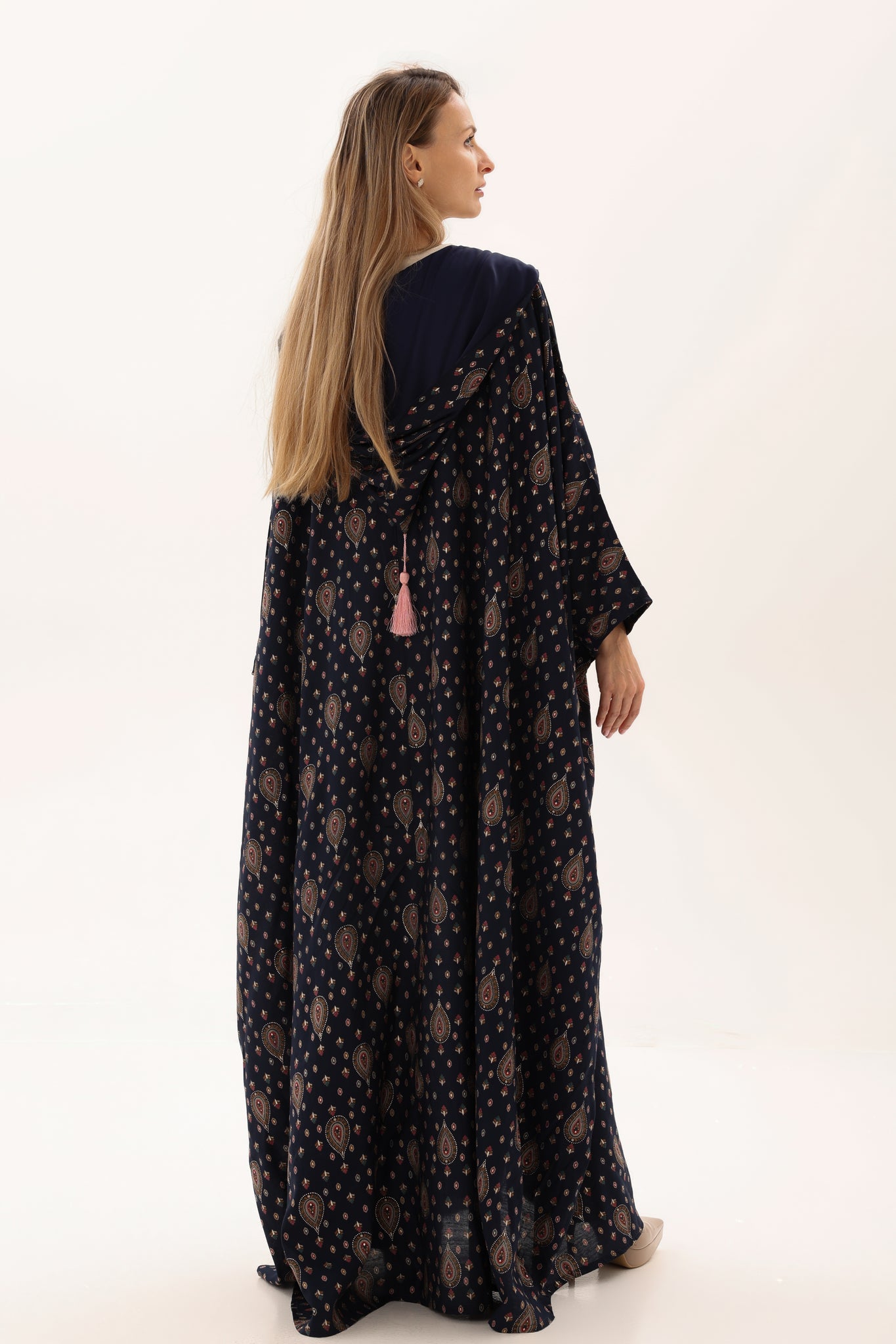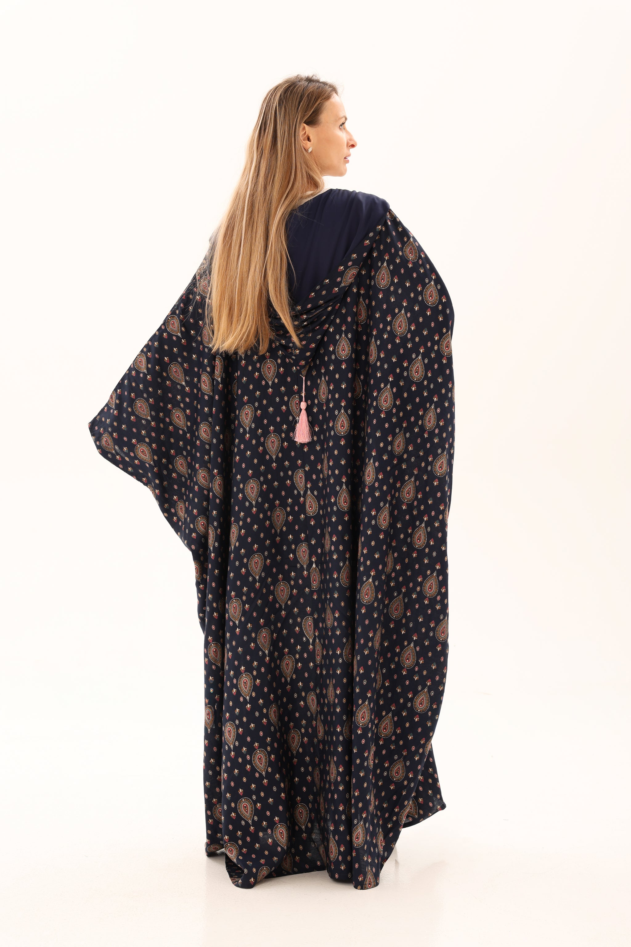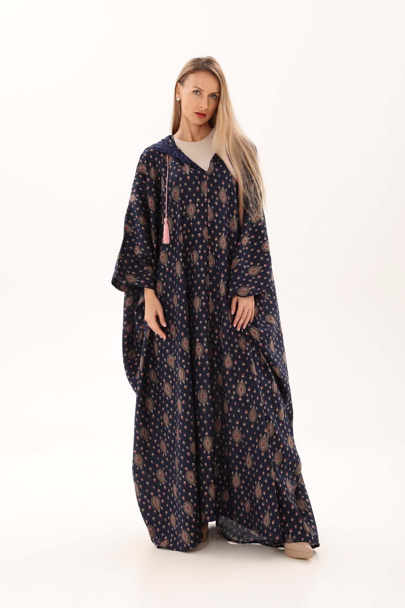 Embrace timeless charm with this Moroccan-inspired abaya, crafted from soft mixed cotton for a lightweight, breathable feel. Set in a rich red hue, the design features an all-over traditional motif that adds warmth and cultural depth. The relaxed, flowing silhouette is enhanced by wide sleeves and a softly draped hood with subtle tie detailing, creating effortless movement and comfort.
